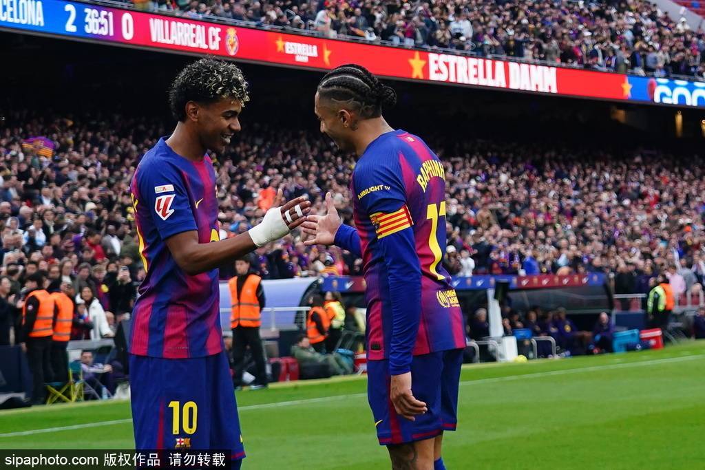 北京时间2月28日凌晨23:15分,西甲联赛第26轮,巴塞罗那主场对阵比利亚雷亚尔。上半场比赛,亚马尔梅开二度,费尔明送出两次助攻,巴萨暂时2-0领先黄潜;下半场,客队由盖耶打入一球缩小比分差距,随后亚马尔再入一球达成帽子戏法,莱万补时锦上添花,最终巴萨4-1战胜比利亚雷亚尔,先赛一场领先身后的皇马4分。